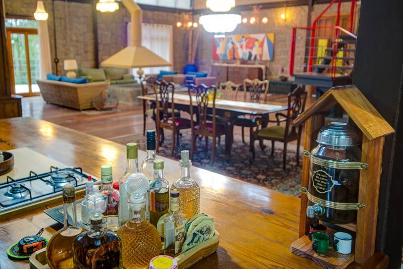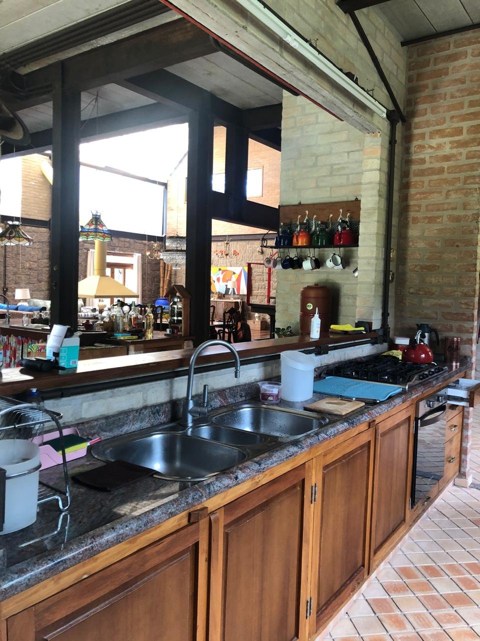 - Cozinha externa para eventos, com fogão de lenha, ampla bancada e equipamentos