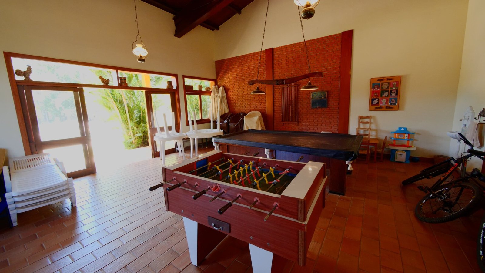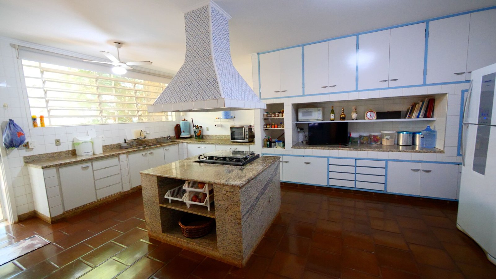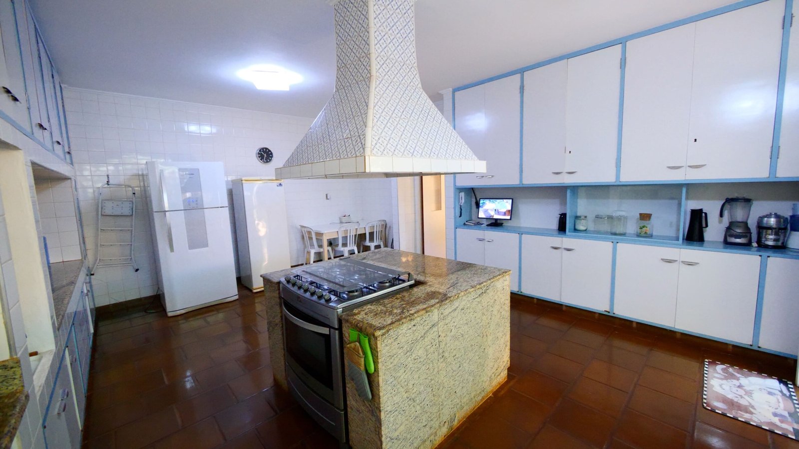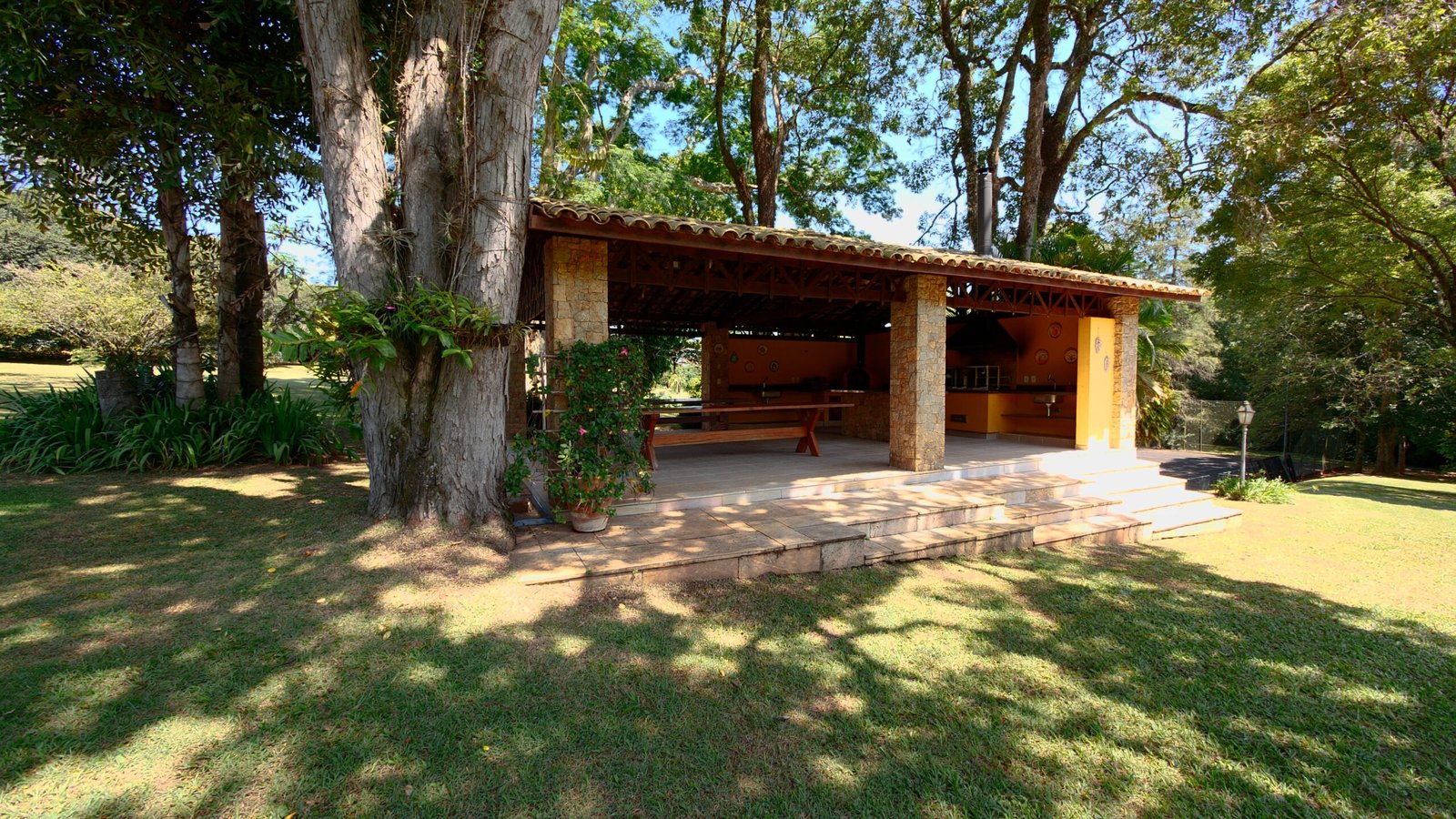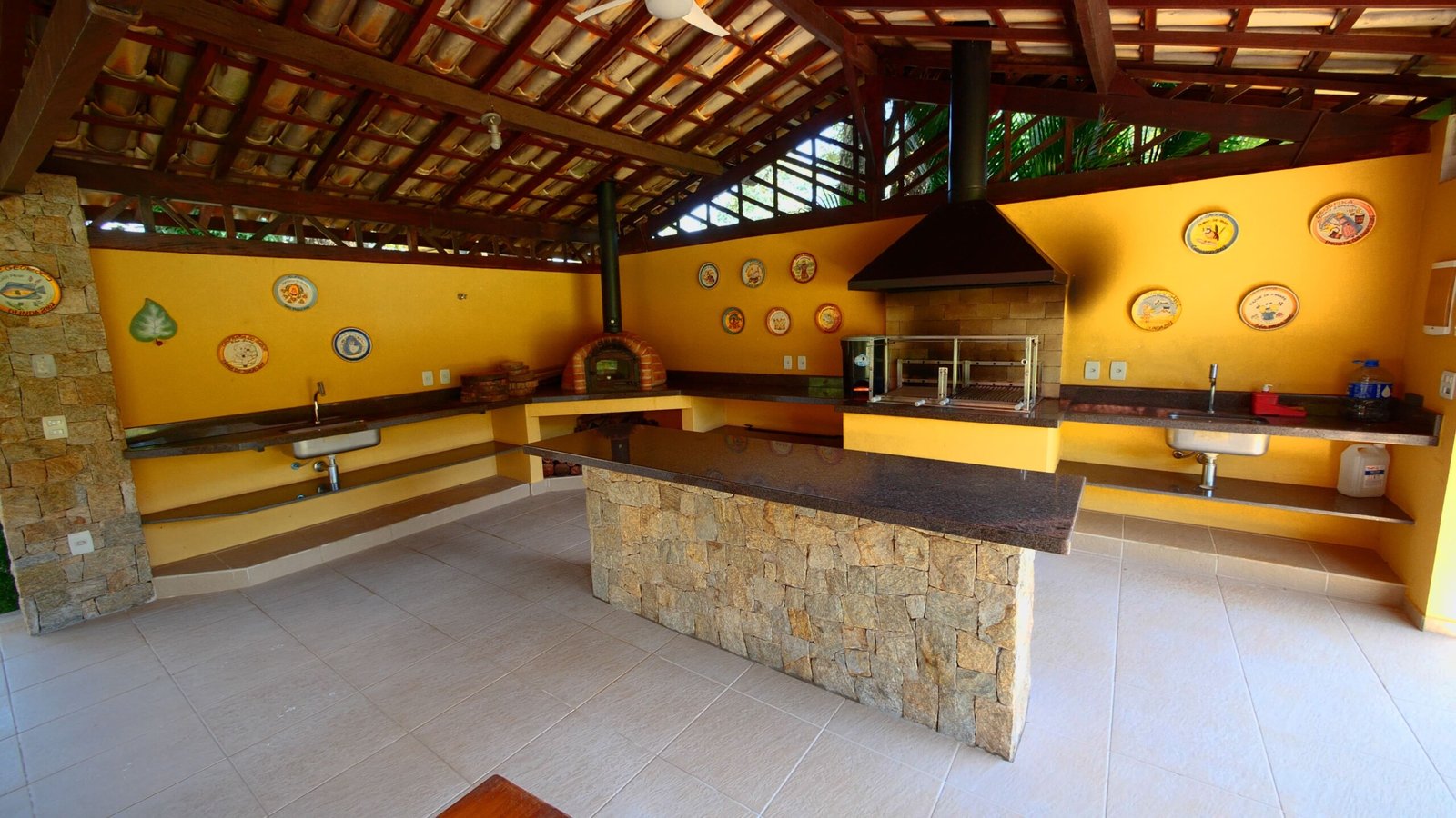 Área de churrasco com forno de pizza, churrasqueira com kit elevatório e coifa.