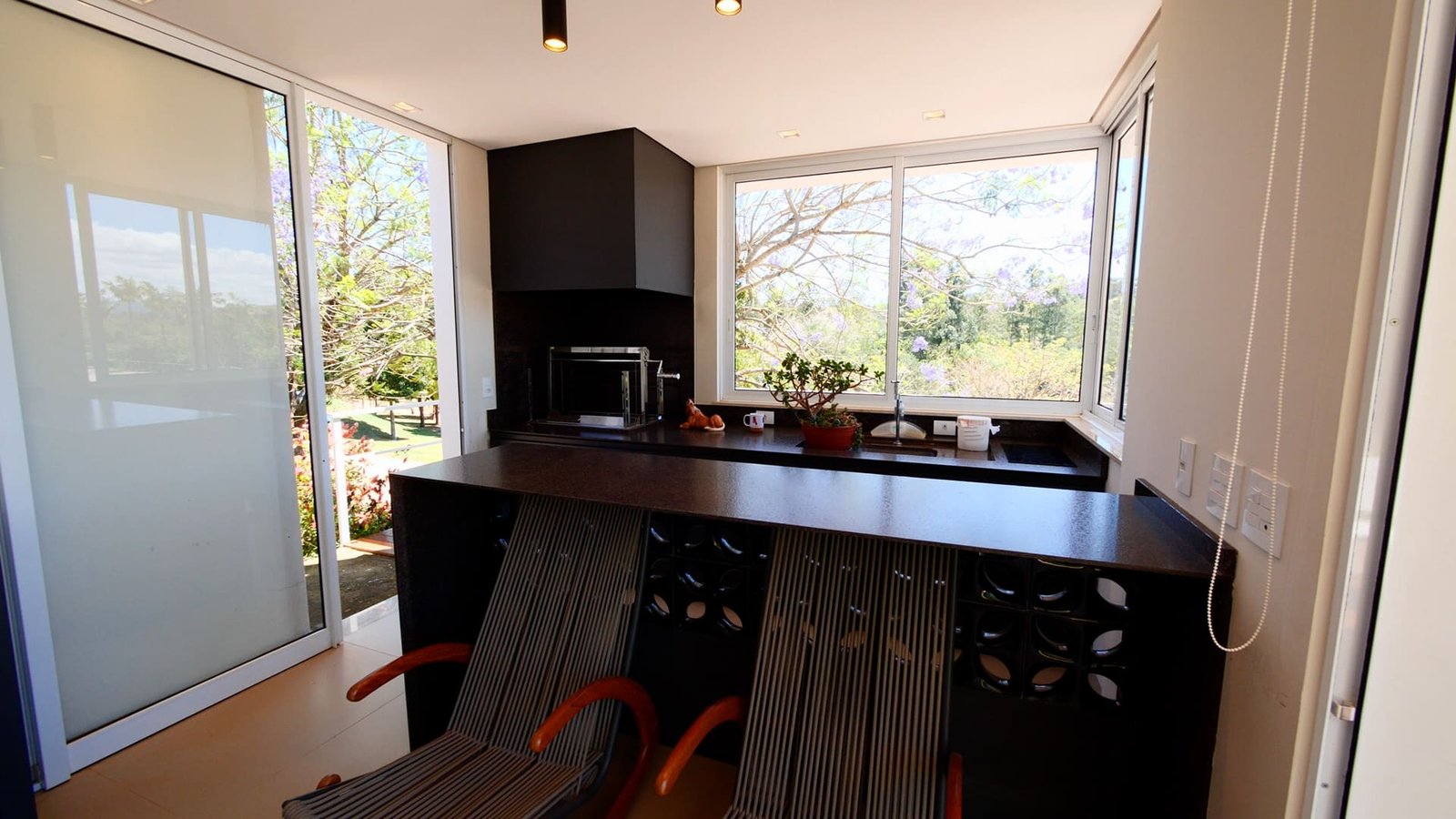 Bar com deck e churrasqueira ao lado da pista.