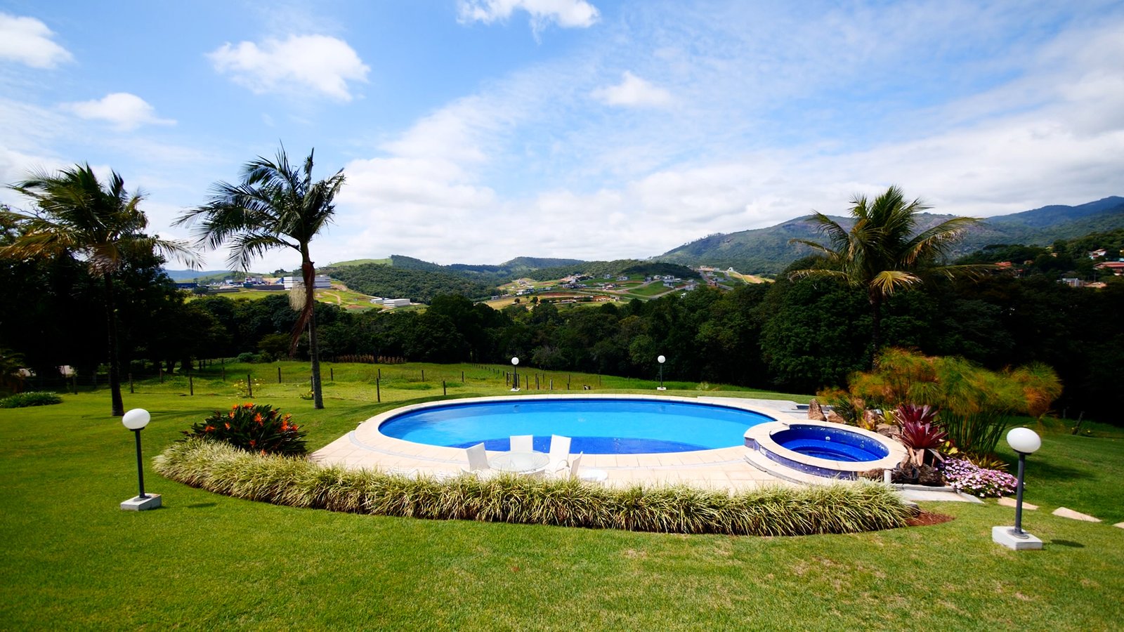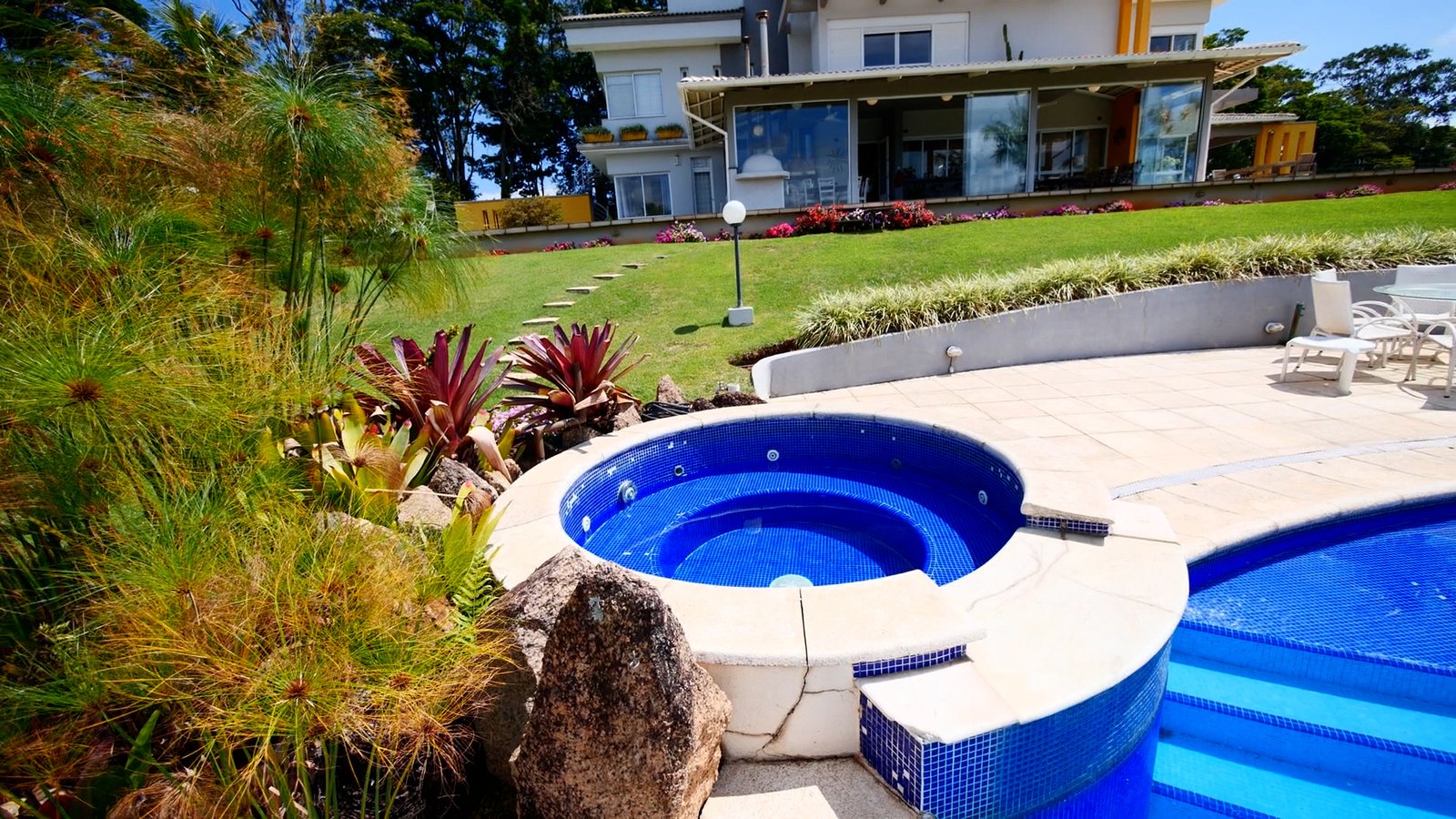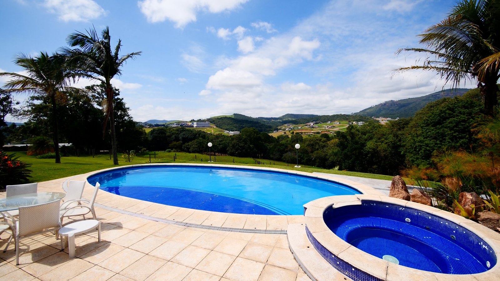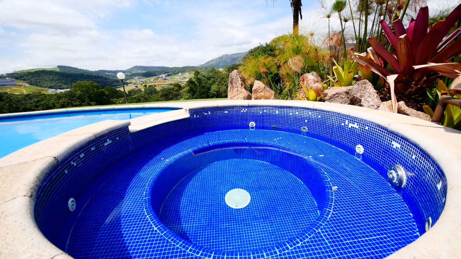 Piscina em formato oval e um spa com hidromassagem c/ aquecimento.