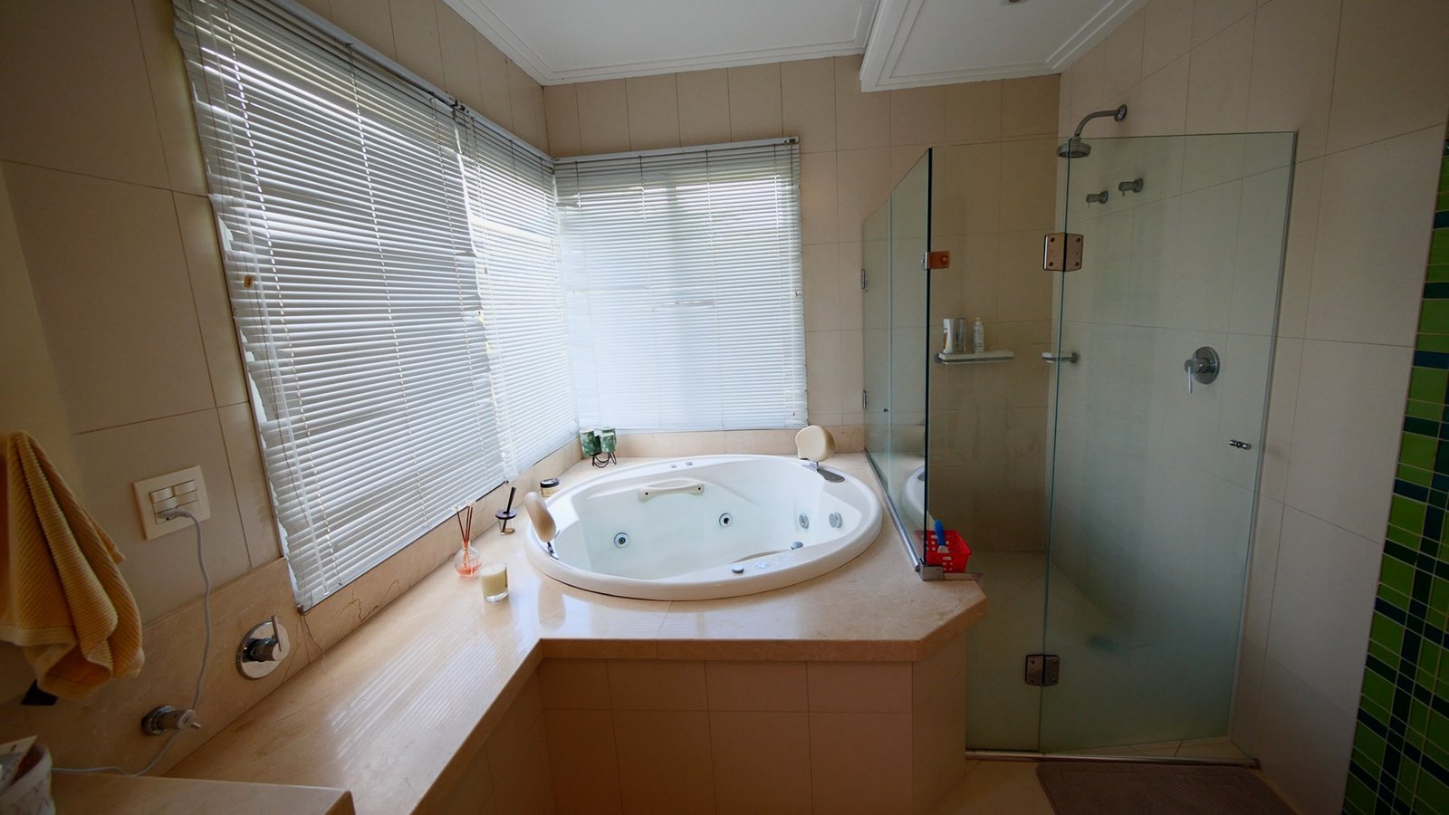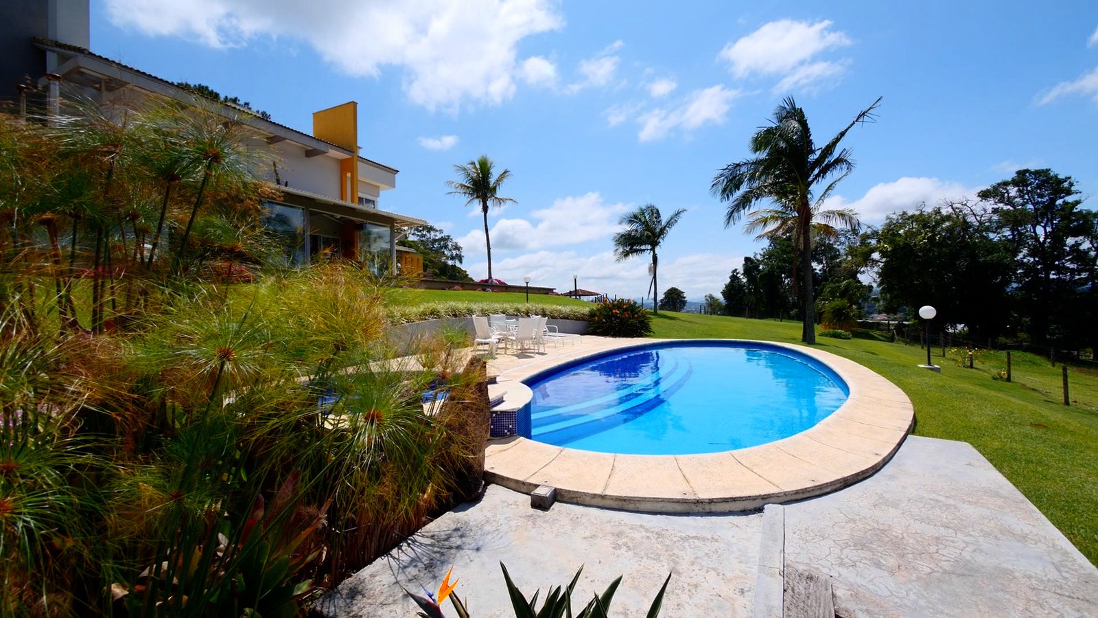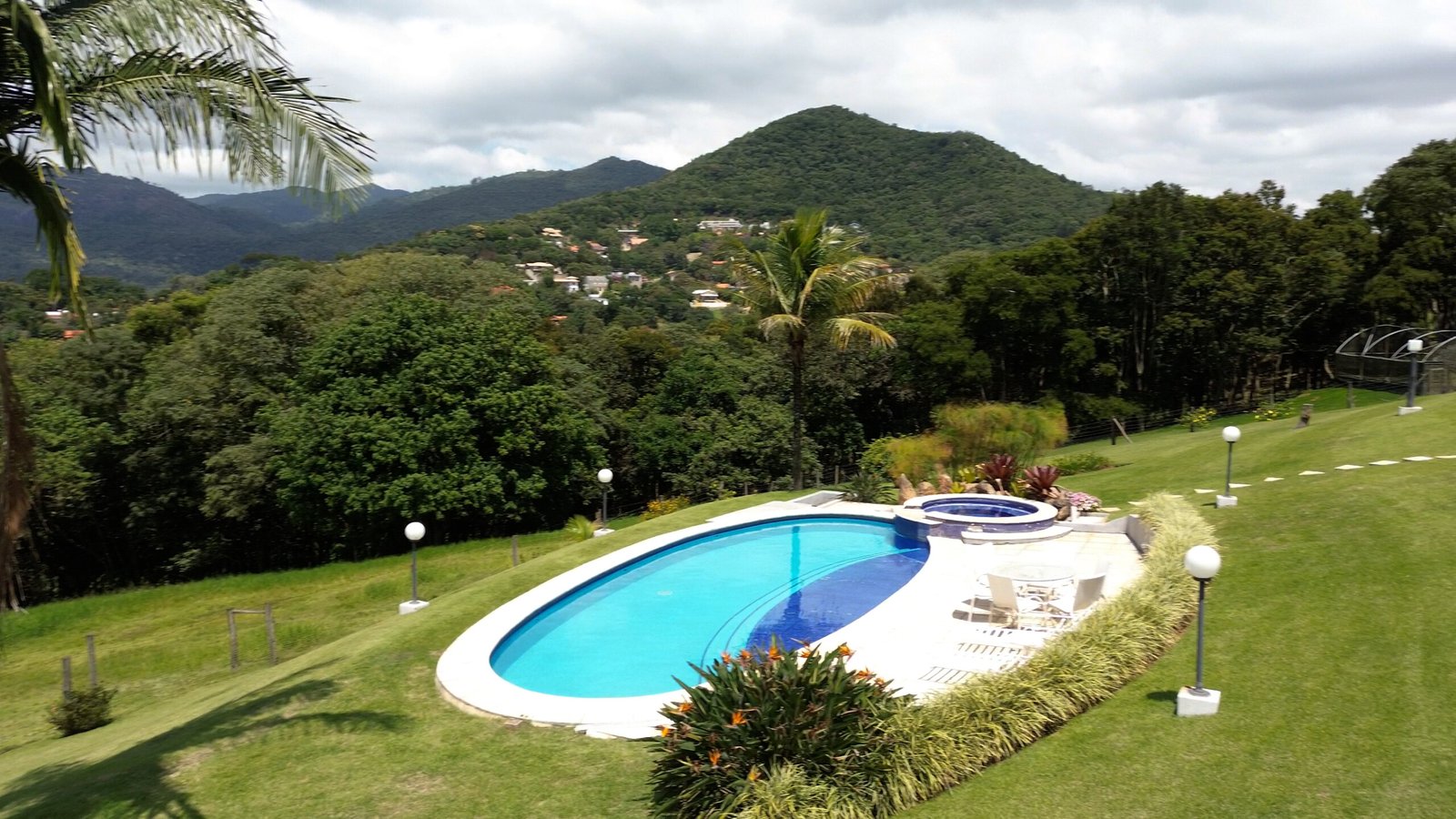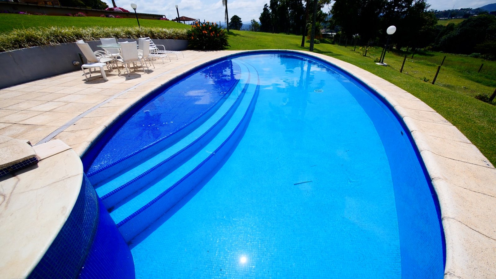 Piscina em formato oval e um spa com hidromassagem c/ aquecimento.