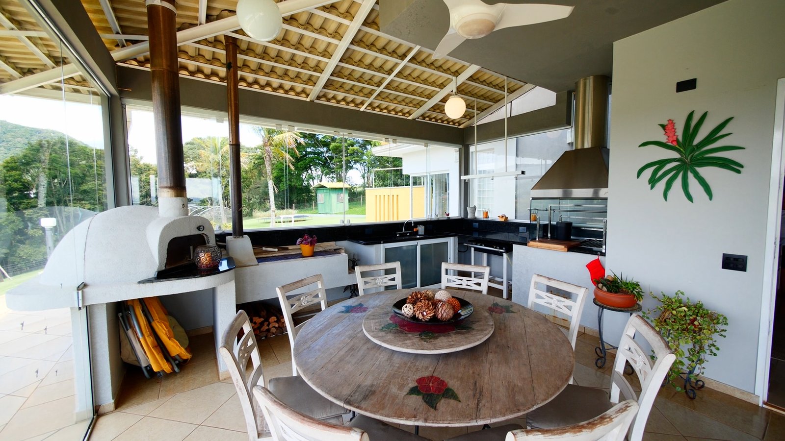 Área Gourmet com forno de pizza, churrasqueira e fogão a lenha.