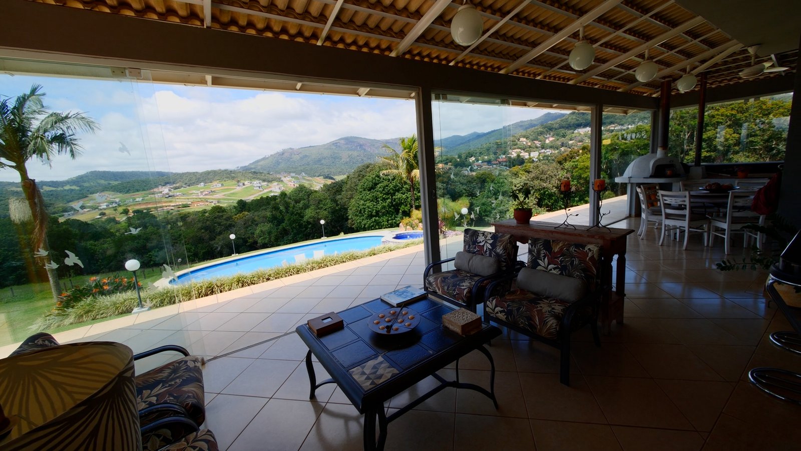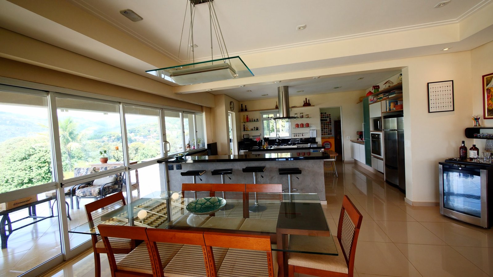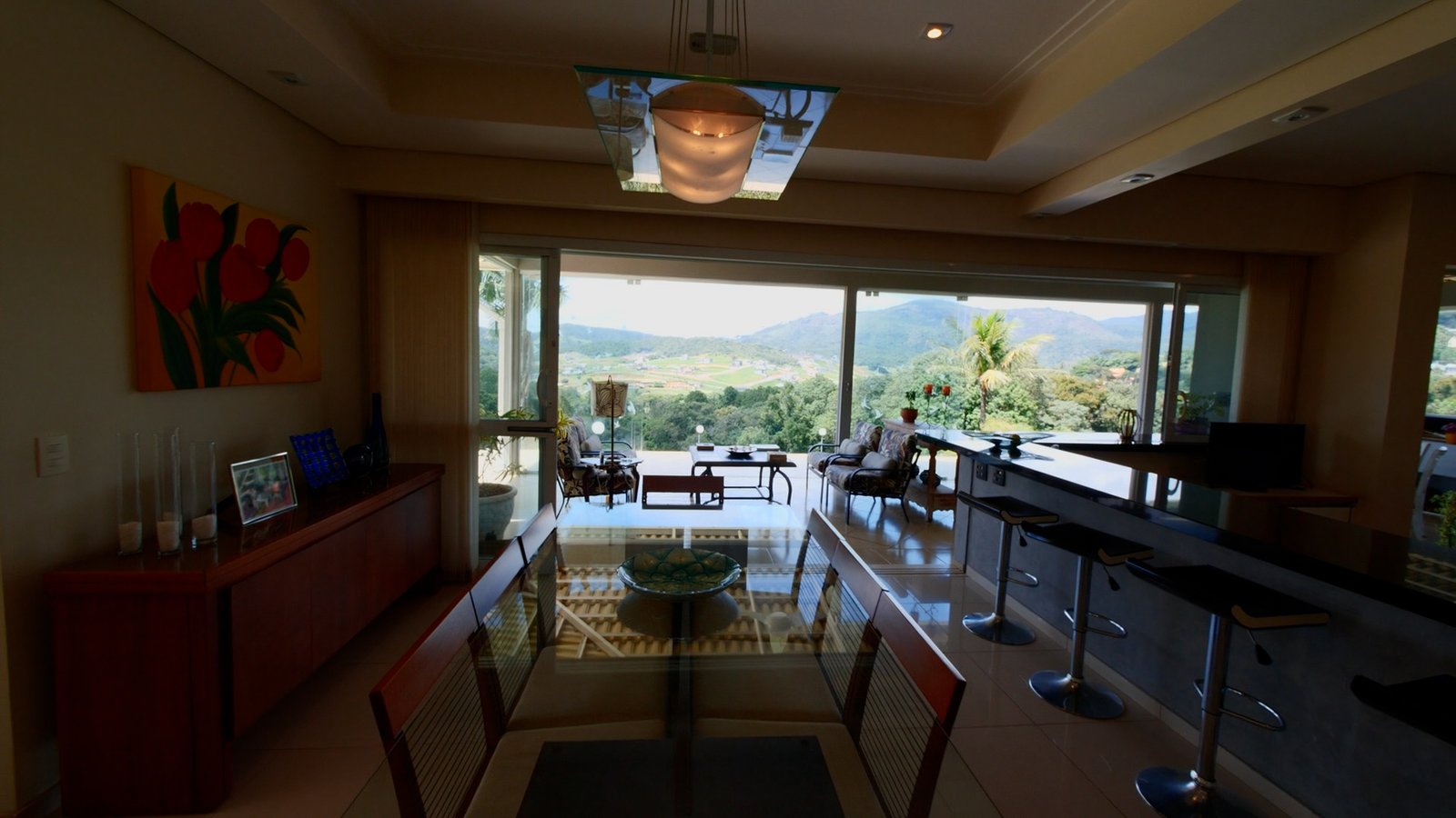 sala de estar/Lareira e jantar integrada a cozinha estilo americana, possue portas em vidro que abrem totalmente com uma bela vista para as montanhas.