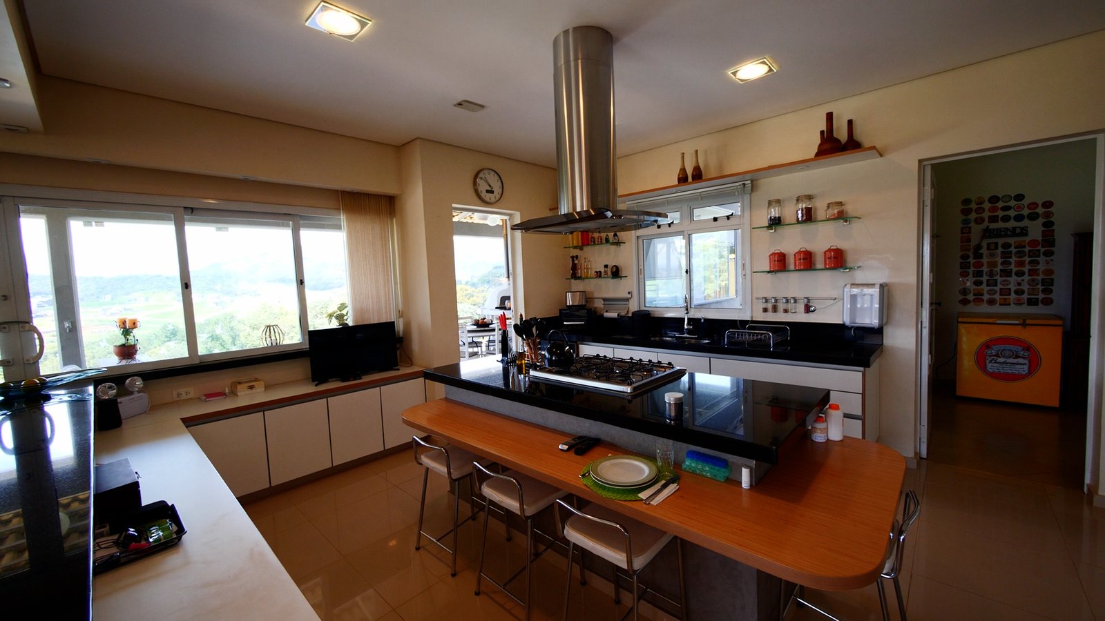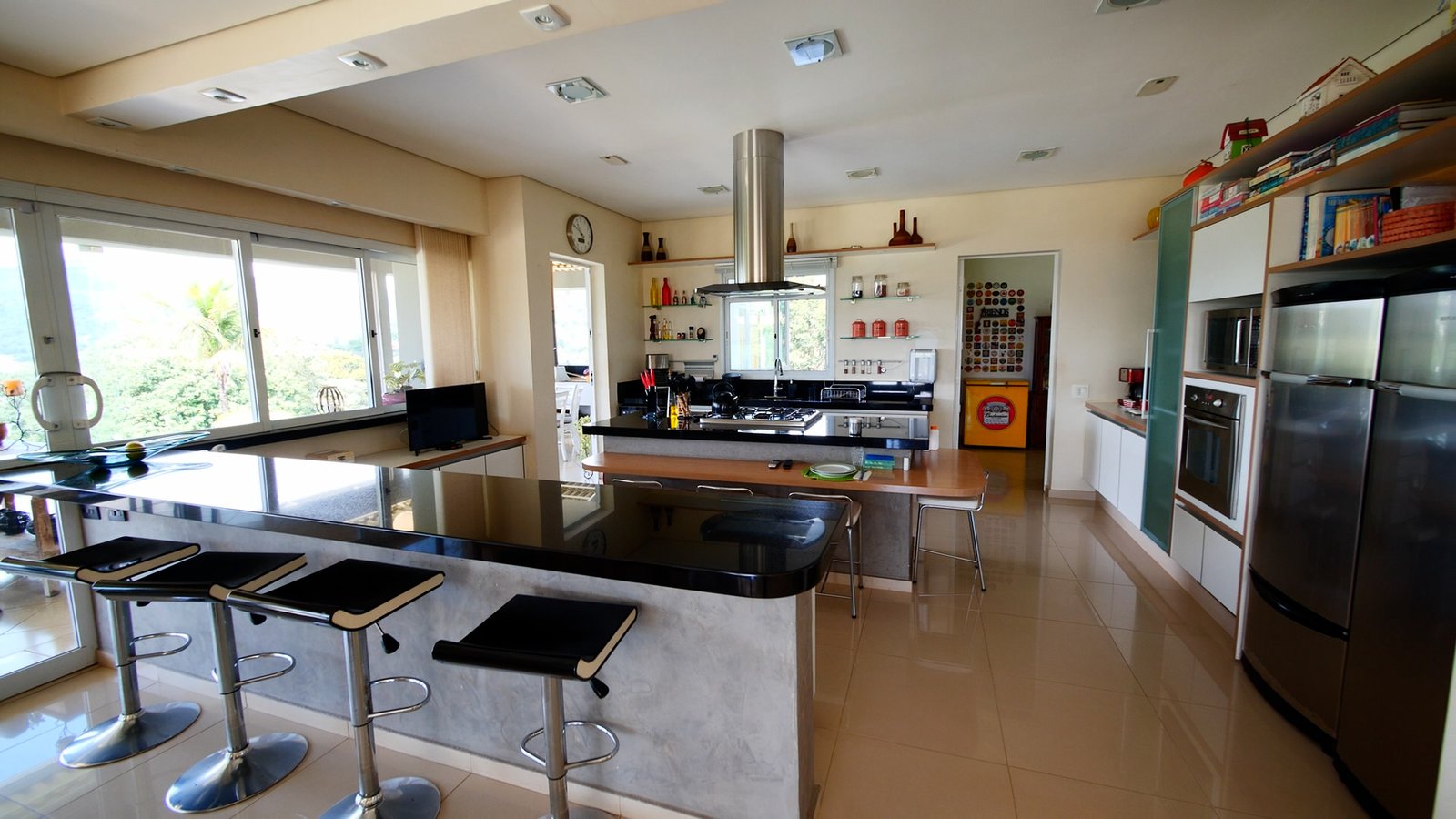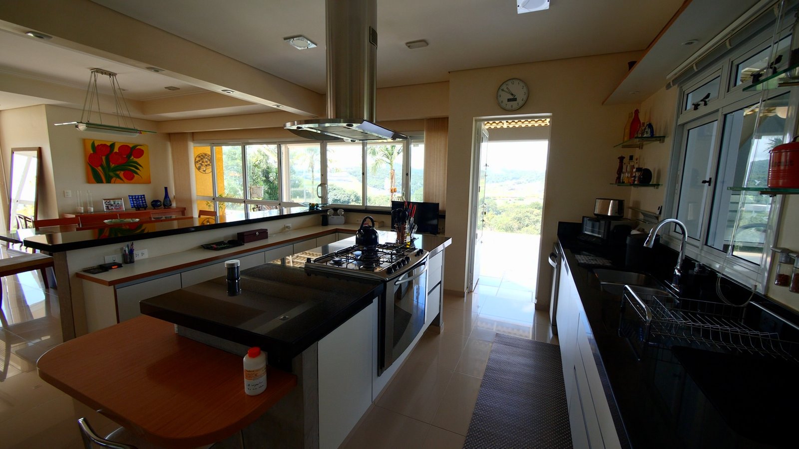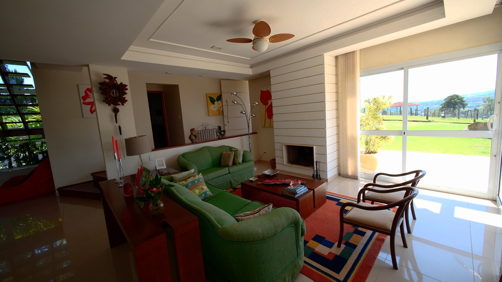 sala de estar/Lareira e jantar integrada a cozinha estilo americana, possue portas em vidro que abrem totalmente com uma bela vista para as montanhas.