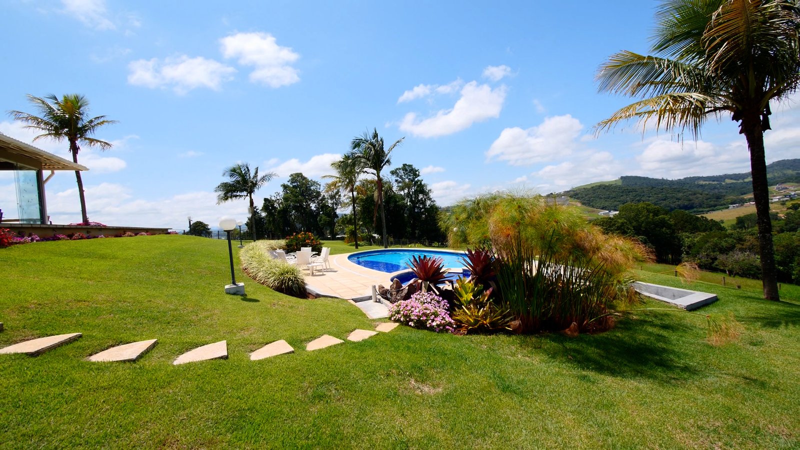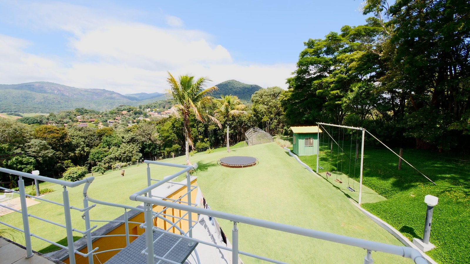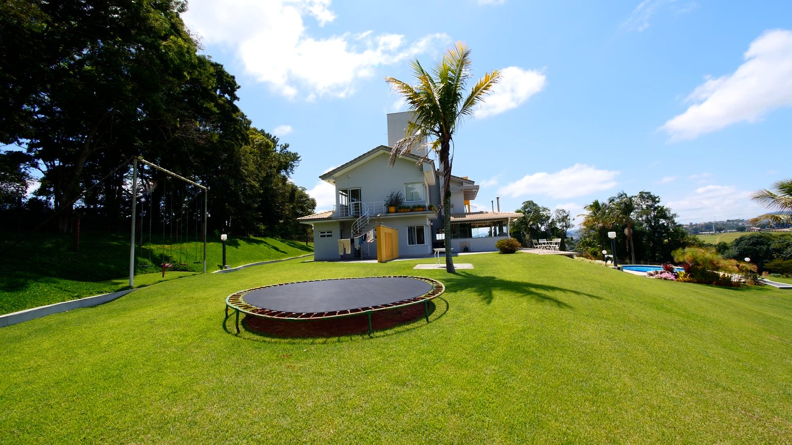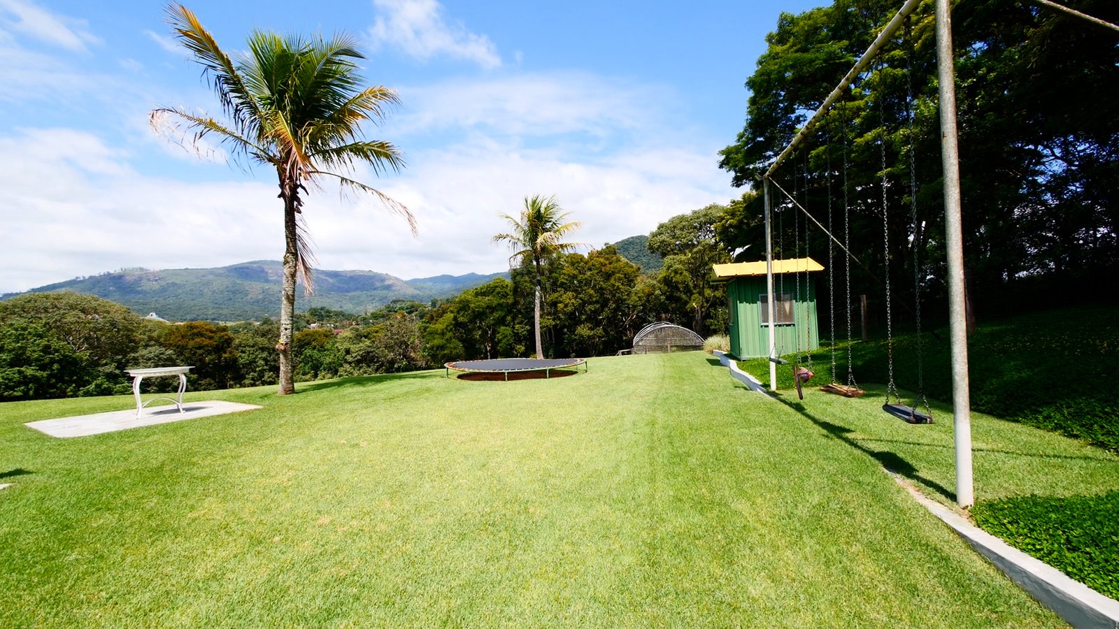 Jardim e Paisagismo com casa de boneca, balanços e brinquedo pula pula.