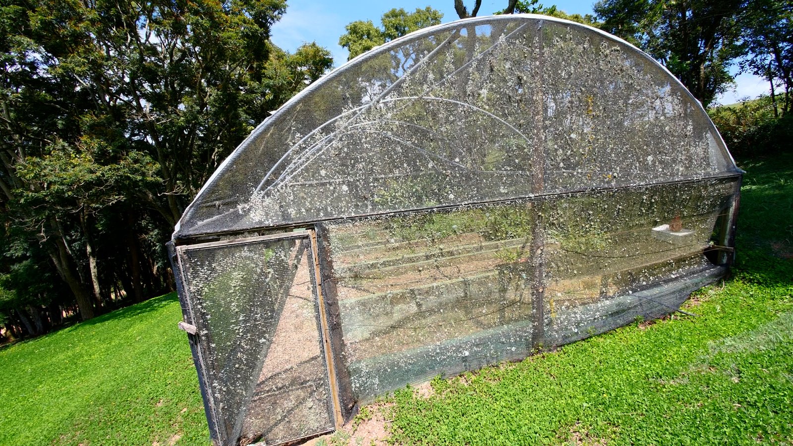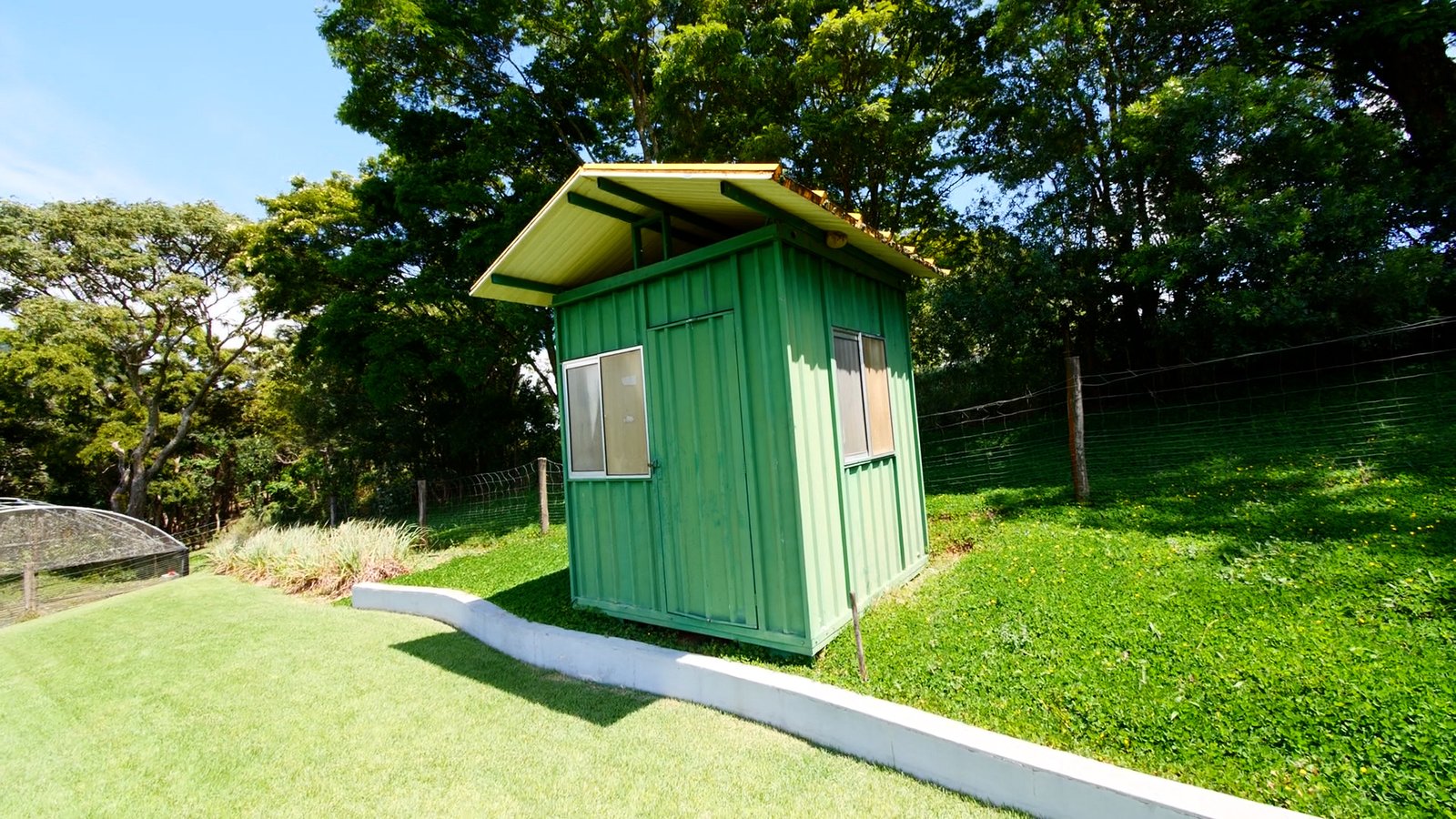 Bosque ao redor e câmeras de monitoramento distribuídas, sistema de alarme.