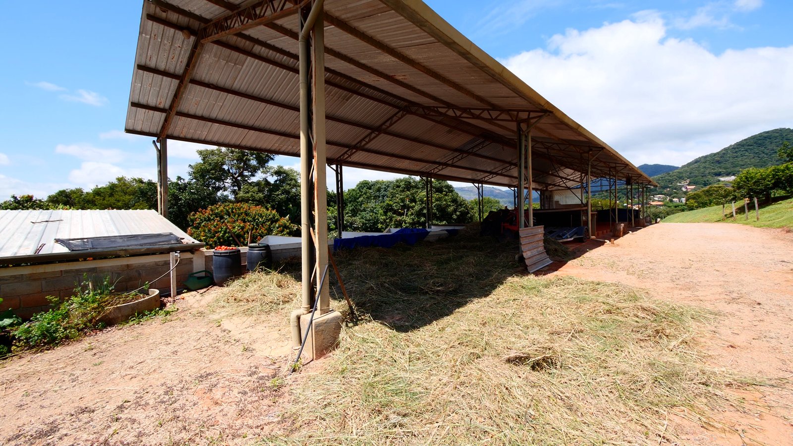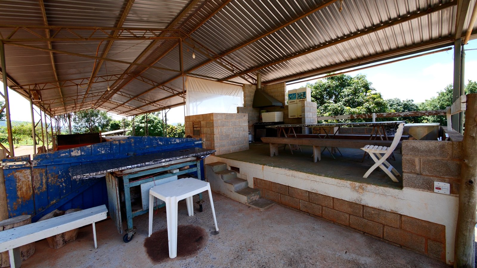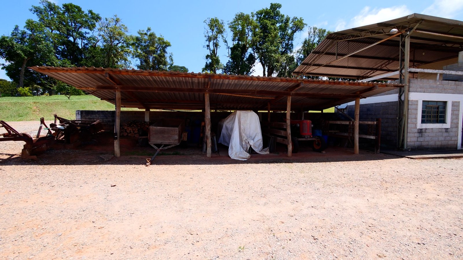 Área para armazenagem de feno, campo de bocha e cozinha com churrasqueira.